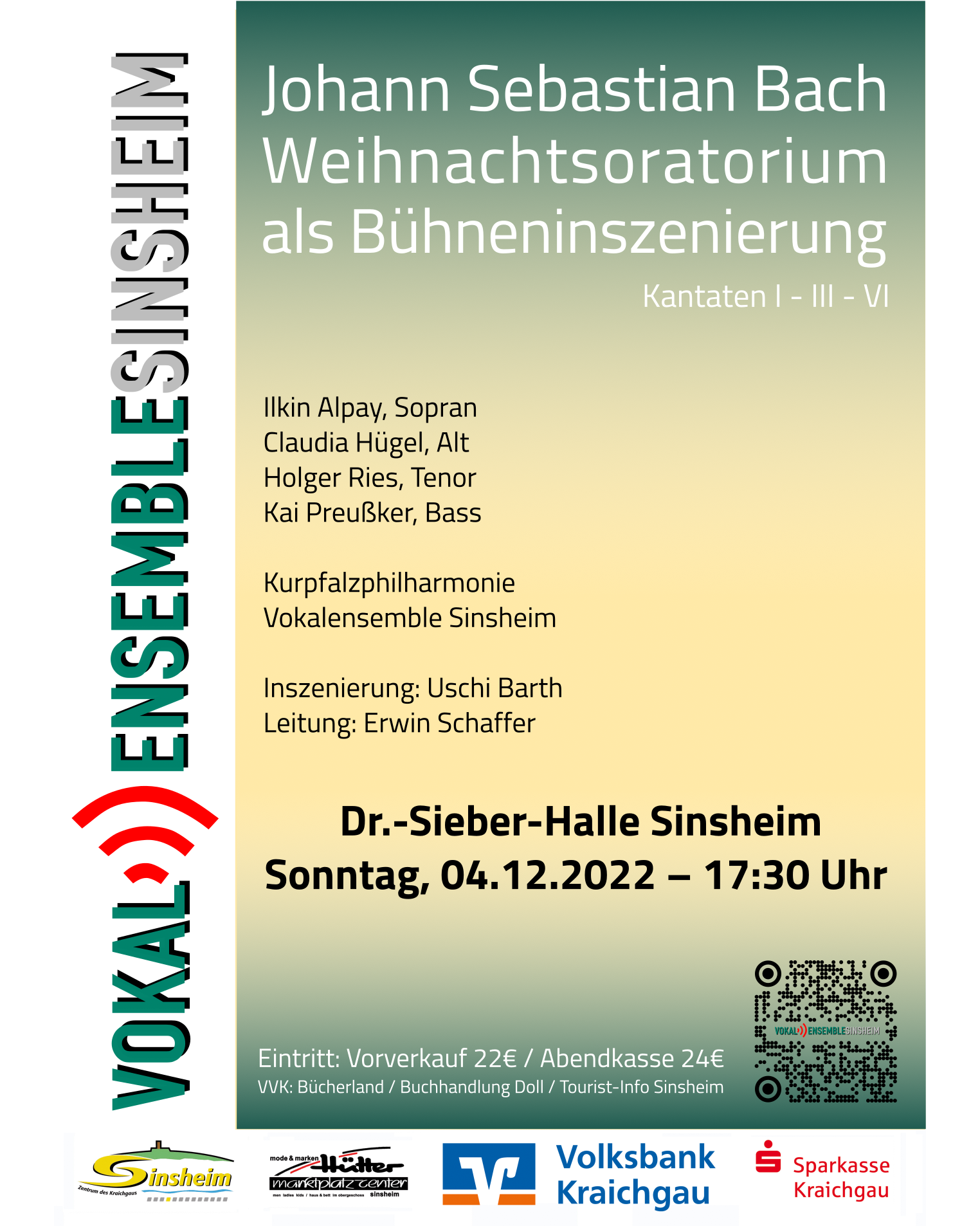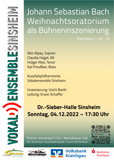 Das Weihnachtsoratorium von Johann Sebastian Bach ist in Sinsheim erstmal wieder nach 5 Jahren zu hören. Das Vokalensemble Sinsheim hat sich dieser berühmtesten aller Weihnachtsmusiken wiederum angenommen und singt die Kantaten 1, 3 und 6. Aufführungsort ist diesmal nicht die Kirche, sondern die Sinsheimer Dr.-Sieber-Halle.