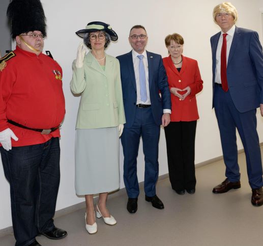 1. Beim Tag der Offenen Tür am 19.01. zur Einweihung der sanierten Dr.-Sieber-Halle konnte das Vokalensemble mit einem parodistischen Auftritt das Publikum begeistern. Denn Queen Elizabeth, Donald Trump und Angela Merkel überbrachten, gesichert durch ein breites Security-Aufgebot, Grußbotschaften und Glückwünsche auf der Bühne. Alt-OB Rolf Geinert moderierte geschickt und konnte alle Beteiligten und das Publikum zum Badnerlied (mit besonderem Sinsheim-Text) animieren. OB Albrecht, hocherfreut über den Besuch der Prominenten